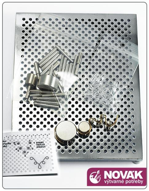 Fém alátét dróttechnikához. Méret 14x11,5 cm, 30 db különböző átmérőjű tű. Teljes útmutató hat mintával és egy üres sablonnal.