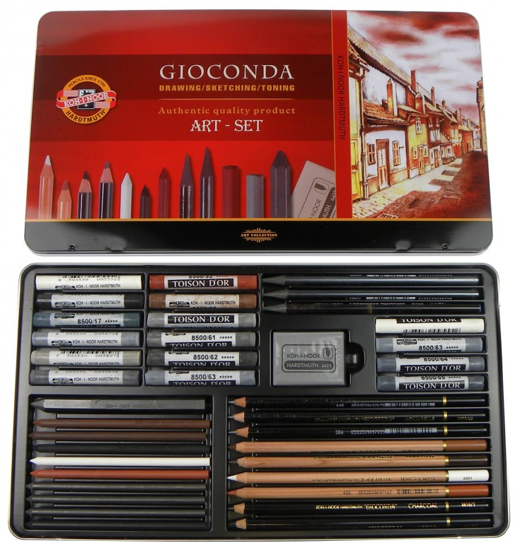 Gioconda rajzkészlet fémdobozban. Mindent tartalmaz, amire a rajzoláshoz szükséged lehet, a precíz és finom részletgazdag munkáktól a nagy területek lefedéséig. Összesen 40 eszköz.