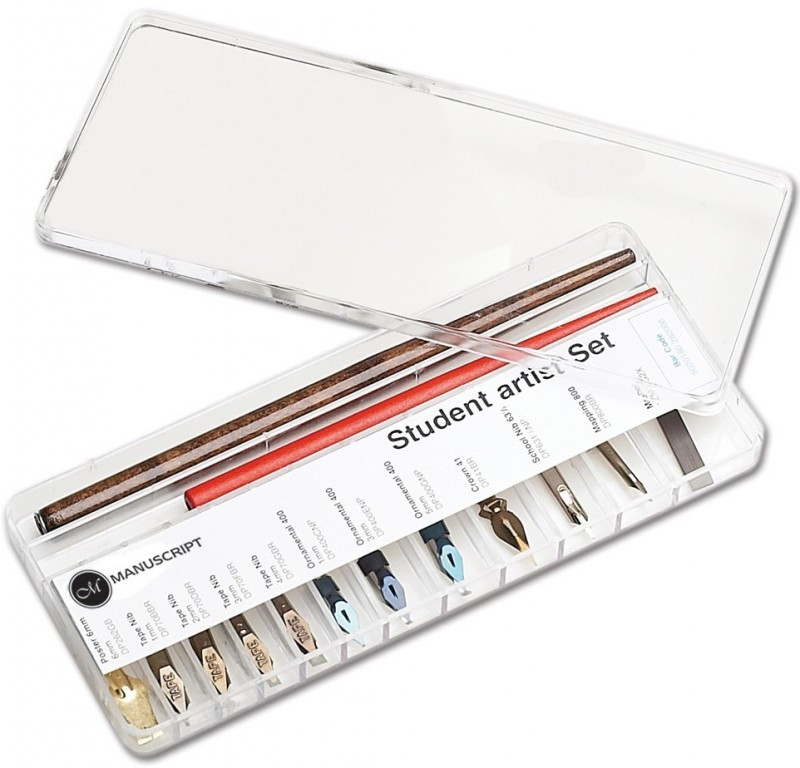 Különböző típusú kalligráfiai tollak nagyméretű készlete. Kezdő és haladó kalligráfusok számára egyaránt ajánlott. A készlet 10 tollat ​​és 2 nyelet tartalmaz.