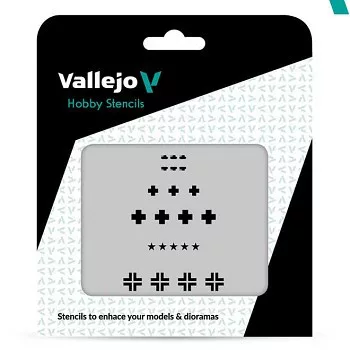 A Vallejo Stencils praktikus modellező sablonok, amelyeket valósághű minták, jelölések és hatások létrehozásához terveztek modelleken, miniatűrökön és diorámákon. Lehetővé teszik különböző motívumok egyszerű felhordását, például álcázási mintákat, technikai jelöléseket, számokat, feliratokat vagy kopási hatásokat. Precíz megmunkálásuknak köszönhetően segítenek éles és egyenletes vonalak elérésében airbrush-sal vagy ecsettel való munkánál.