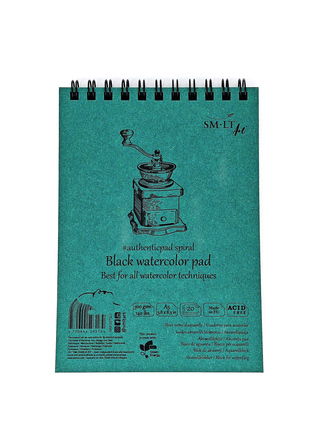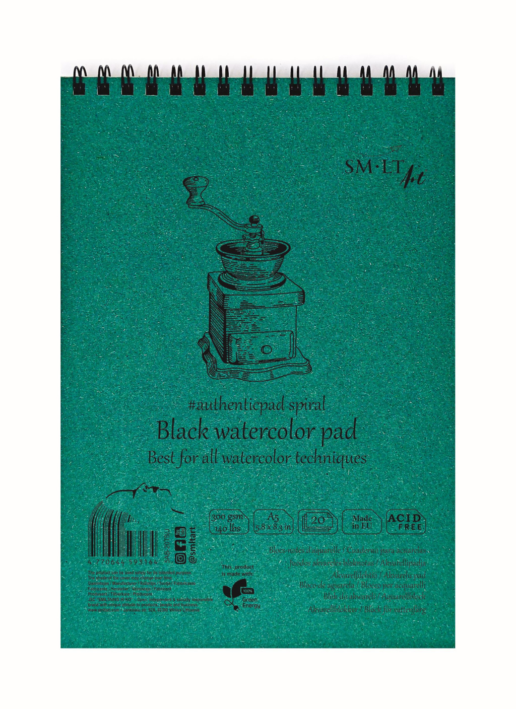Vázlattömb - SMLT Black watercolor authenticpad, spirálos, mikroperforált - fekete, 300gr, 20 lapos A5