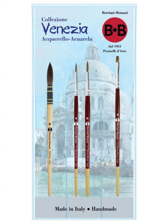 4 darabos ecsetkészlet akvarellfestékekhez, Velence városmotívummal. A készlet tartalmaz egy prémium minőségű mókusszőrből készült akvarell ecsetet és 3 cobolyszőr ecsetet. Akár ajándékba is alkalmas.