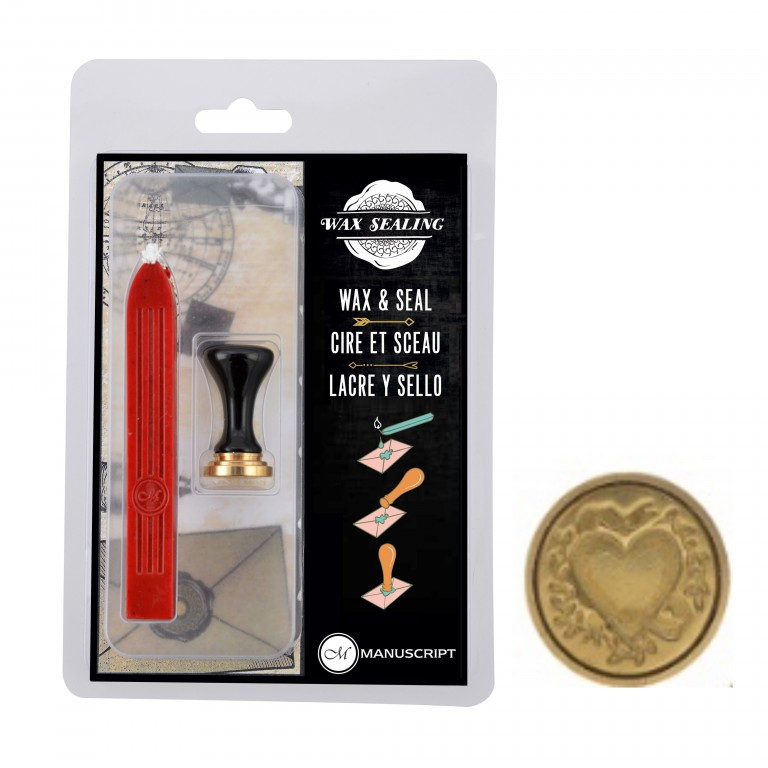 Kis pecsét lakkozott fa nyéllel és szív mintával. Tartalmaz egy piros pecsétviaszt kanóccal a könnyű felhelyezés érdekében.