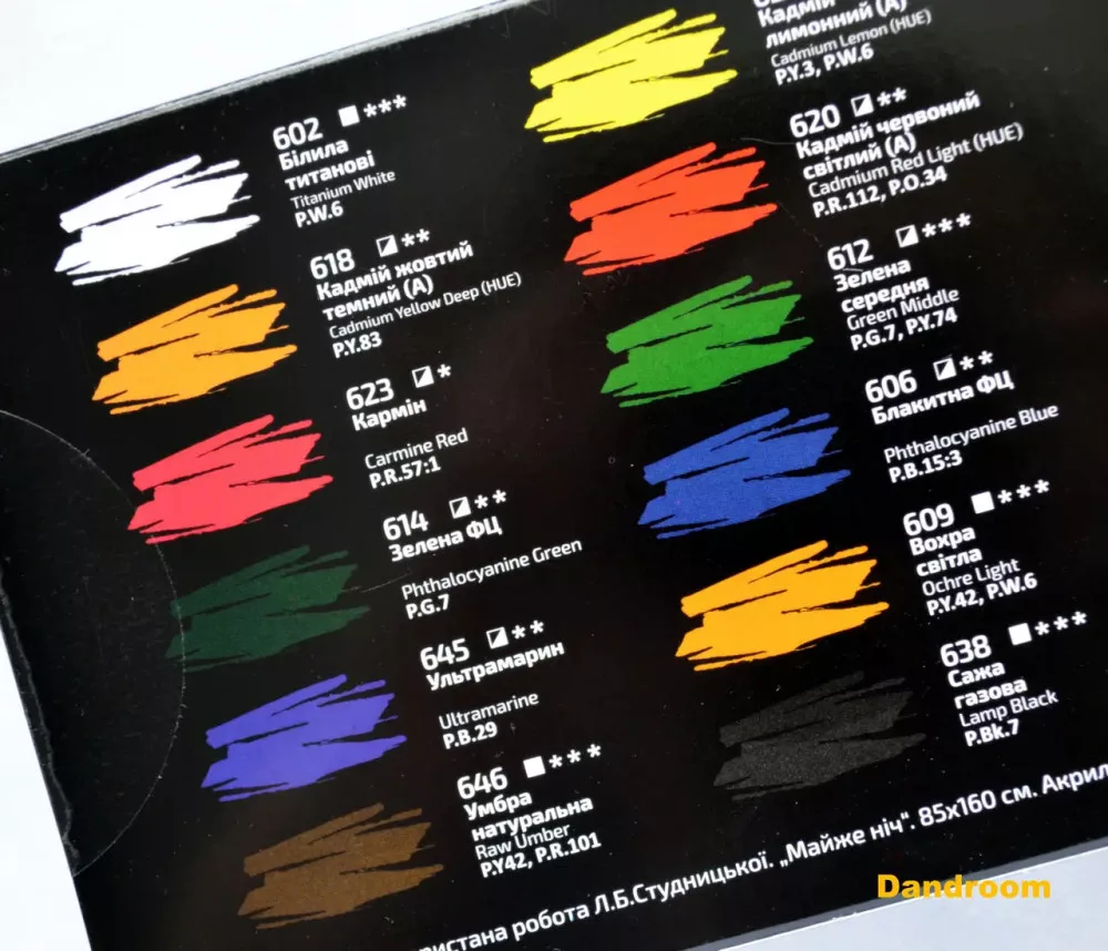 A készlet 12 alapárnyalatot tartalmaz fehértől feketéig, amelyekből szinte bármilyen szín keverhető. Száradás előtt vízzel hígítható, száradás után vízálló. A kész festményt ajánlott akril lakkal rögzíteni.